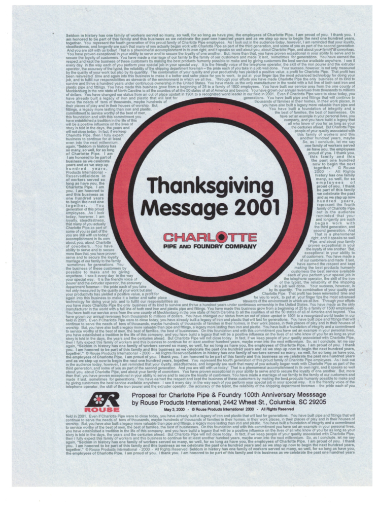 Charlotte Pipe and Foundry had reason to be thankful and celebrate in September 2001. They had risen from a small family company in 1901 to an international leader in their field in 2001. They did it while upholding great American values.